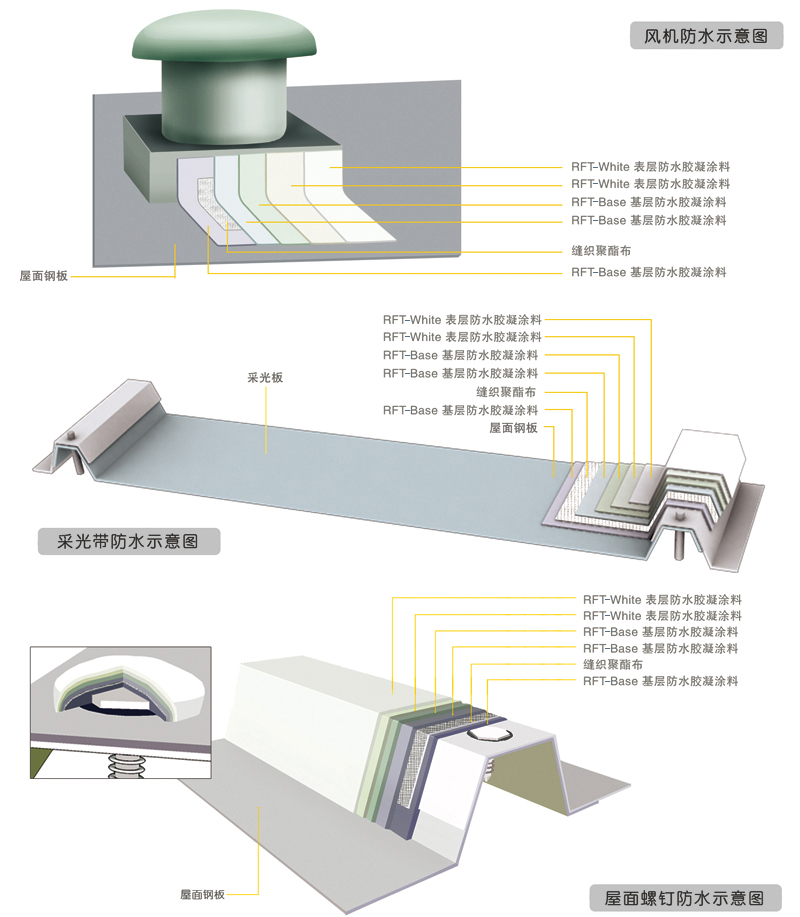 二、三层智诚基层涂料+一层缝织聚酯布+二层智诚表层涂料 |