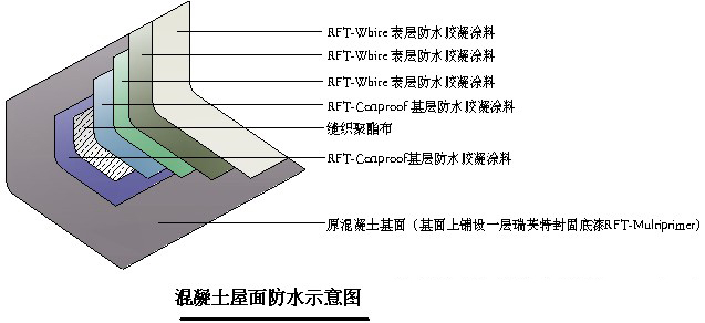 康特宝”智诚混凝土专用防水系统RFT-Conproof = 智诚多功能底漆RFT-Multiprimer + 智诚混凝土涂料RFT-Conproof + 缝织聚酯布 + 智诚混凝土涂料RFT-Conproof + 智诚表层涂料RFT-White + 智诚表层涂料RFT-White + 智诚表层涂料RFT-White(最终厚度1.3-1.4㎜)